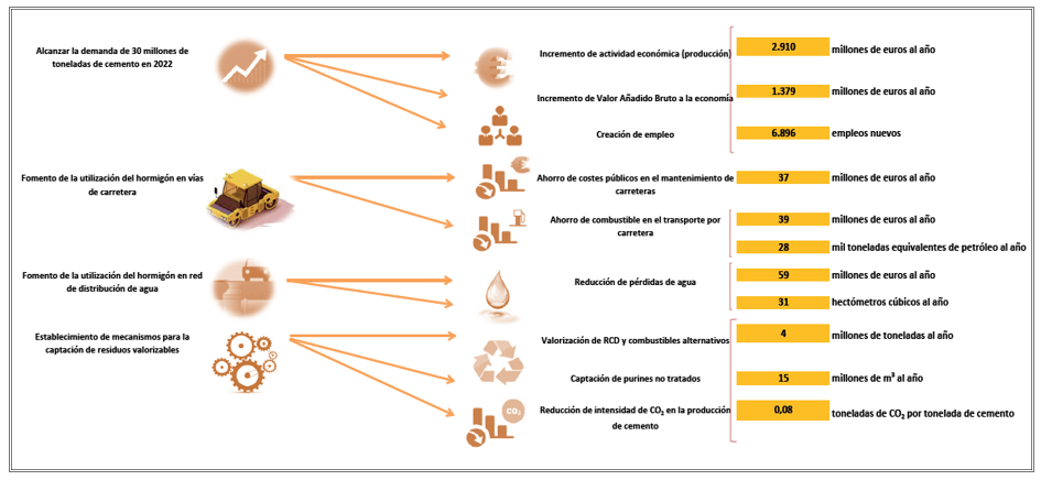 Todas ellas se traducen en datos cuantificables como el incremento en casi 1.400 millones de euros anuales del valor añadido bruto del sector industrial español; el ahorro en el gasto público de mantenimiento de carreteras y vías férreas de 43 millones de euros anuales -gracias a los menores costes de mantenimiento y conservación de viales construidos o rehabilitados con hormigón-; la valorización de 4 millones de toneladas de residuos en sustitución de combustibles fósiles y materias primas no renovables, y la creación de empleo.