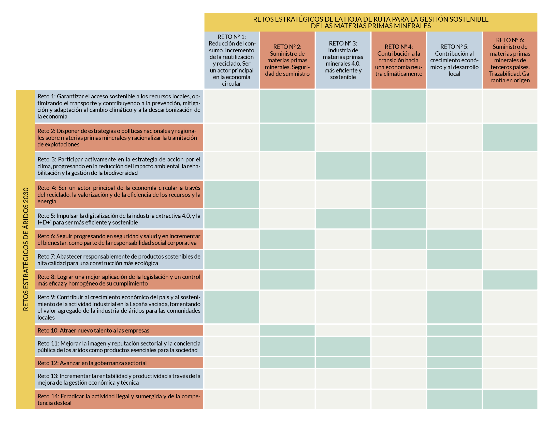 En este contexto, Áridos 2030 llega en el momento más oportuno para dar solución a los catorce Retos Sectoriales identificados previamente. Doce de ellos son compartidos con el resto de Europa, mientras que los otros dos son específicos españoles y están vinculados con la necesidad de mejorar la productividad y la rentabilidad y con la erradicación de la competencia desleal.