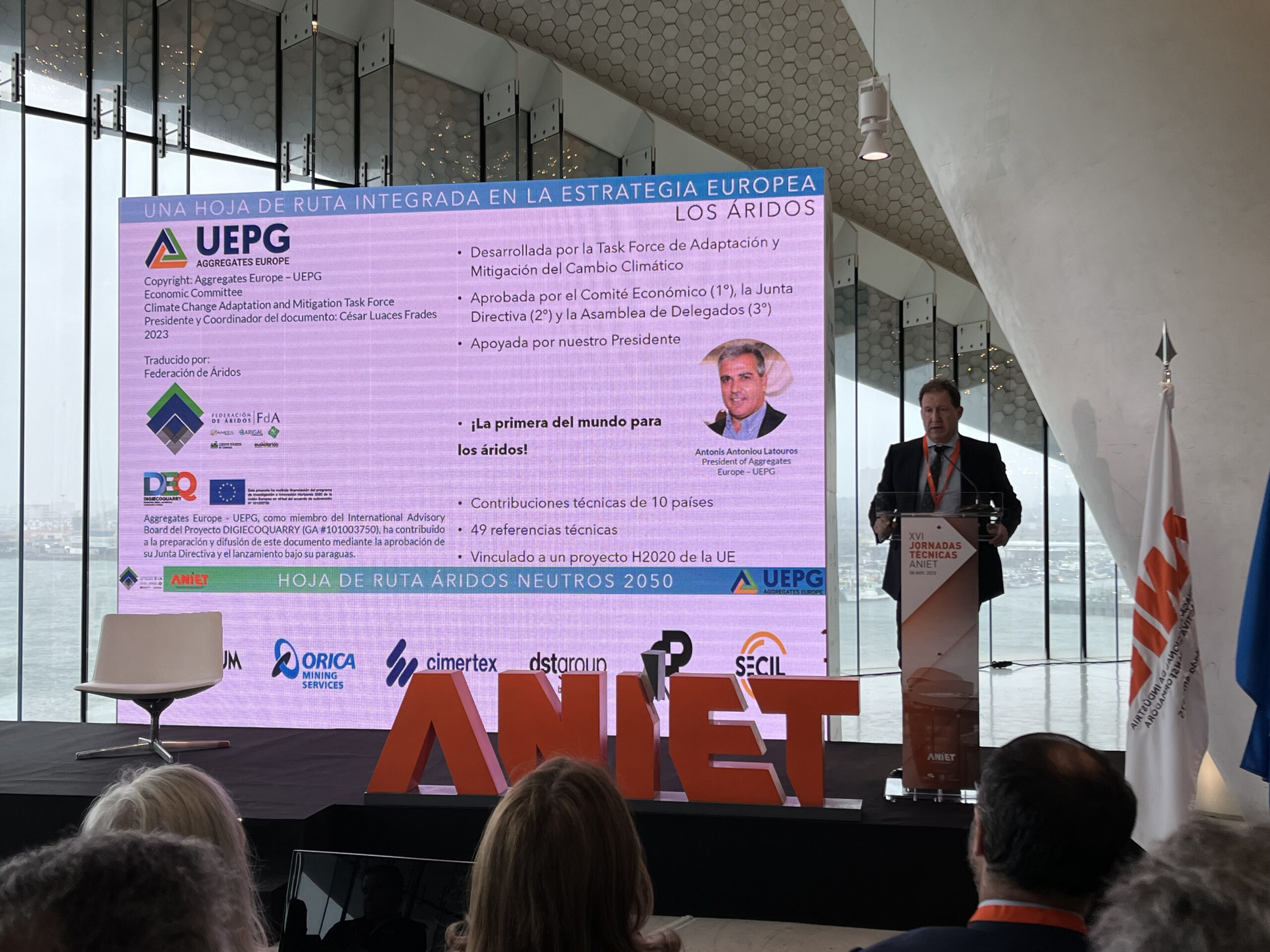 Aniet, la Asociación Nacional de la Industria Extractiva y Transformadora de Portugal, celebra hoy unas ambiciosas Jornadas Técnicas en Oporto en la que se tratan temas de vital importancia para el sector de la minería en general y para el de los áridos en particular. La Jornada que ha contado con la presentación de Jorge Mira Amaral, presidente da Aniet y Francelina Pinto, directora general de esta asociación, incluye temáticas como la caracterización de canteras (a cargo de Paulo Pita -Divisão de Pedreiras do Norte, y Martim Moranguinho Direção Geral de Energia e Geologia); el análisis de casos de éxito como el proyecto de recuperación de Gouvães, uno de los proyectos hidroeléctricos más grandes realizados en Europa (por Nuno Faria, director de proyectos de dst); la presentación de la Hoja de Ruta para la Neutralidad Climática en la Industria de Áridos: Áridos Neutros 2050 a cargo de César Luaces, director general de la Federación de Áridos y presidente del Grupo de Trabajo sobre Mitigación y Adaptación al Cambio Climático de Aggregates Europe – UEPG. Luaces también se encargó de presentar los proyectos europeos liderados por ANEFA y financiados por la Comisión Europea: Rotate y DigiEcoQuarry en una intervención bajo el título de: Digitalización Huella Medioambiental y Circularidad en la Industria.