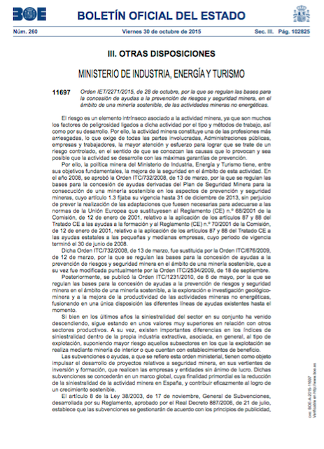 El Ministerio de Industria, Turismo y Comercio publicó en el BOE el pasado viernes, 30 de octubre, la Orden IET/2271/2015, de 28 de octubre, por la que se regulan las bases para la concesión de ayudas a la prevención de riesgos y seguridad minera, en el ámbito de una minería sostenible, de las actividades mineras no energéticas, que serán de aplicación hasta el 31 de diciembre de 2020.