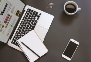 Creative flat lay design of workspace desk with laptop, notebook