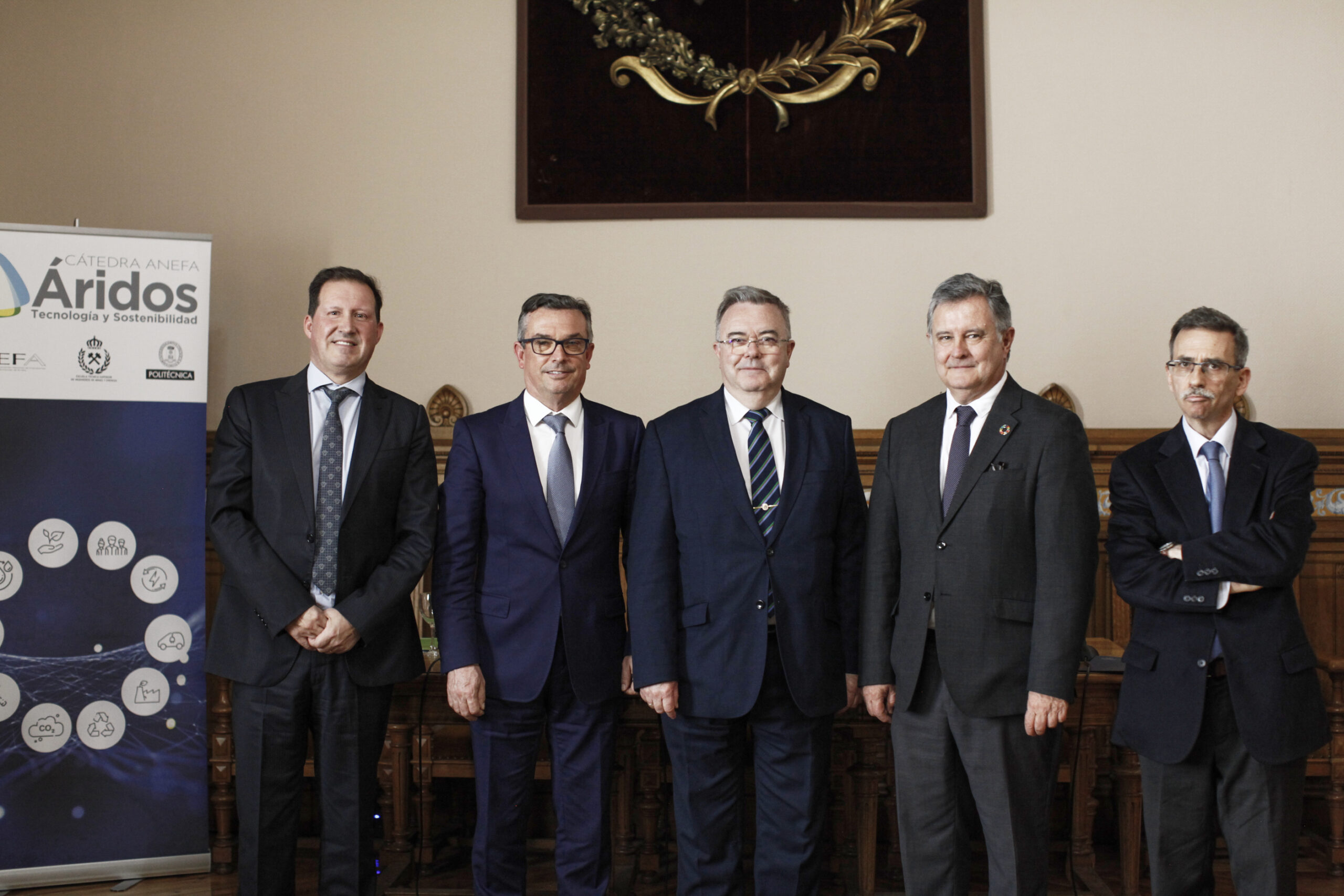 En el acto han intervenido el rector de la Universidad Politécnica de Madrid, Guillermo Cisneros; el director de la Escuela, Francisco Javier Elorza; el coordinador de la cátedra y catedrático de la universidad; Carlos López Jimeno y el presidente de Asociación Nacional de Empresarios Fabricantes de Áridos – ANEFA, Ramón Ruberte.