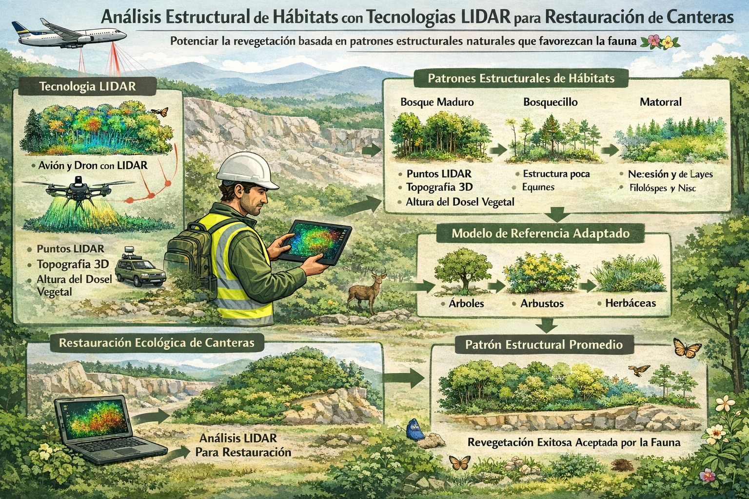 - LIDAR-REFAUNA: restauración basada en modelos 3D. El proyecto utiliza modelos tridimensionales de alta resolución para analizar la estructura de los hábitats naturales. Estos datos permiten identificar patrones que servirán de referencia para diseñar restauraciones más precisas, optimizar los procesos de revegetación y favorecer la colonización temprana de la fauna.